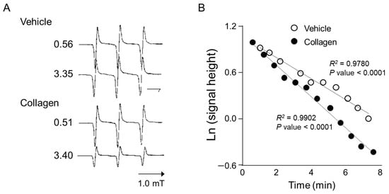 Anesthetized mice received intravenous administration of the nitroxyl radical probe CAT-1 (4-trimethylammonium-2,2,6,6-tetramethylpiperidine-1-oxyl), and electron spin resonance (ESR) spectra were recorded in vivo immediately after administration to assess reactive oxygen species (ROS) generation. Representative ESR spectra from vehicle-treated controls showed relatively stable and higher signal intensities at both early (0.56 min) and later time points (3.35 min), indicating minimal ROS generation and slower CAT-1 decay (Figure 2A, Vehicle). In contrast, mice treated with collagen exhibited a notable decrease in ESR signal intensity at the corresponding time points, demonstrating substantially higher ROS generation and faster CAT-1 decay rates (Figure 2A, collagen). Specifically, collagen administration led to a pronounced reduction in ESR signal intensities, indicating accelerated ROS-mediated oxidation and the rapid clearance of the nitroxyl radical probe from circulation.