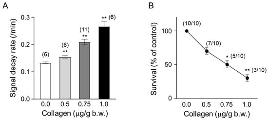 Mice were administered collagen at increasing concentrations (0.5, 0.75, and 1.0 µg/g body weight) to evaluate the dose-dependent effects on ROS generation and survival rates in vivo. Collagen administration led to a clear dose-dependent increase in ROS generation, measured by the accelerated decay rate of the ESR signal intensity of the nitroxyl radical probe CAT-1 (Figure 4A). Specifically, the CAT-1 signal decay rate significantly increased at 0.5 µg/g collagen (approximately 0.155/min, ** p < 0.01) and was further enhanced at 0.75 µg/g (approximately 0.210/min; ** p < 0.01) and reached the highest level at 1.0 µg/g body weight (approximately 0.267/min, ** p < 0.01). These results indicated robust ROS induction associated directly with increased collagen concentrations.