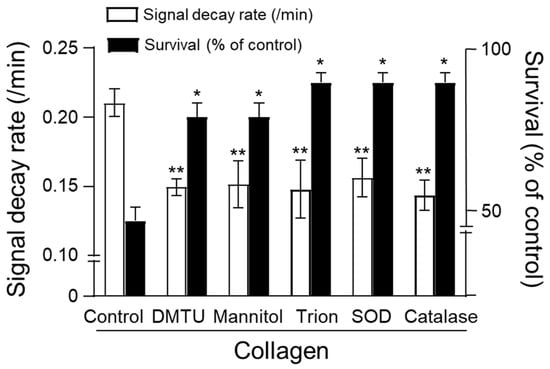 The protective effects of enzymatic and non-enzymatic antioxidants against collagen-induced oxidative stress were assessed by measuring CAT-1 decay rates and survival in mice. Collagen administration alone significantly increased the CAT-1 decay rate, indicating enhanced ROS generation, and substantially reduced survival rates compared to vehicle-treated controls (Figure 5). Treatment with non-enzymatic antioxidants, including dimethylthiourea (DMTU), mannitol, and Tiron, significantly attenuated the collagen-induced increase in CAT-1 decay rates, demonstrating effective ROS scavenging (DMTU: ~0.14/min, Mannitol: ~0.15/min, Tiron: ~0.14/min; ** p < 0.01 compared to collagen alone). Similarly, enzymatic antioxidants, superoxide dismutase (SOD) and catalase, also significantly reduced CAT-1 decay rates (SOD: ~0.15/min; catalase: ~0.14/min; ** p < 0.01).