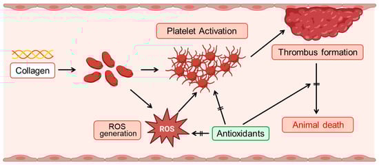 Schematic illustration of collagen-induced ROS production and platelet activation, and the protective role of antioxidants. Collagen exposure induces reactive oxygen species (ROS) generation, which subsequently triggers platelet activation. Activated platelets aggregate, facilitating thrombus formation. Enhanced thrombus formation can ultimately lead to animal death. Antioxidants effectively mitigate these adverse effects by suppressing ROS generation, thereby inhibiting platelet activation, reducing thrombus formation, and improving survival outcomes.