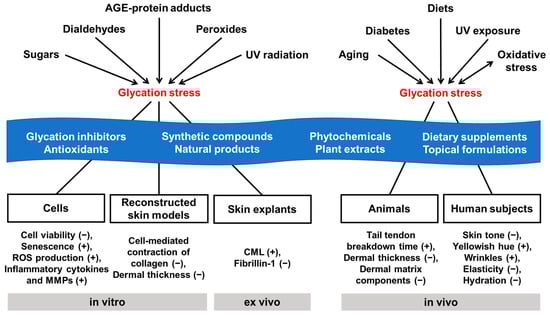 It is necessary to recognize that glycation stress may be crucial, especially in patients with diabetes, older people, and people who mainly eat carbohydrate-based meals. These people are advised to reduce high-carbohydrate diets, high-AGE diets, and UV exposure or to increase physical activity in addition to medical management [151,152,153]. It is clear that eliminating the cause of glycation stress through disease management and lifestyle modification is the primary option for glycation-induced skin aging. A secondary option may be the appropriate use of dietary supplements or topical formulations containing anti-glycation agents or antioxidants. Multiple levels of evidence from in vitro, ex vivo, in vivo, and clinical studies over the past 30 years support that glycation-induced skin aging can be mitigated by certain synthetic and natural agents with antiglycation and/or antioxidant activity (Figure 1).