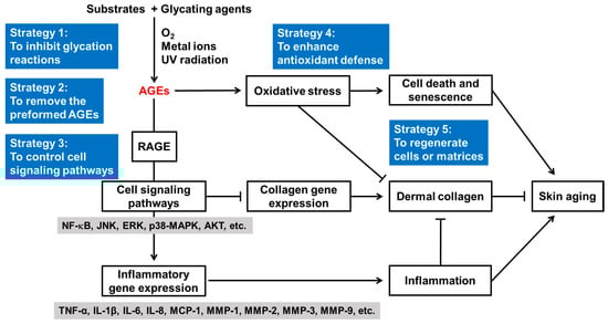 If we divide the process of glycation causing skin aging into two parts, the first step is the production of new AGEs through chemical reactions, and the second step is the occurrence of biological effects induced by existing AGEs (Figure 2). In the first step, when a glycation agent reacts with a substrate, the reaction is affected by oxygen, catalytic metals, UV rays, etc. [157,158]. In the second step, AGEs cause oxidative stress and stimulate RAGE-mediated cell signaling pathways, resulting in the upregulation of inflammatory cytokines and the downregulation of collagen. Overall, glycation stress leads to cell death or senescence, inflammation, and skin aging. Therefore, various treatment strategies against glycation-induced skin aging can be envisioned, such as strategy 1 to prevent the production of AGEs, strategy 2 to remove the preformed AGEs, strategy 3 to control RAGE-mediated cell signaling pathways leading to the upregulation of inflammatory gene expression and downregulation of collagen gene expression, strategy 4 to assist or enhance cellular antioxidant defense, and strategy 5 to regenerate cells and matrix environments.