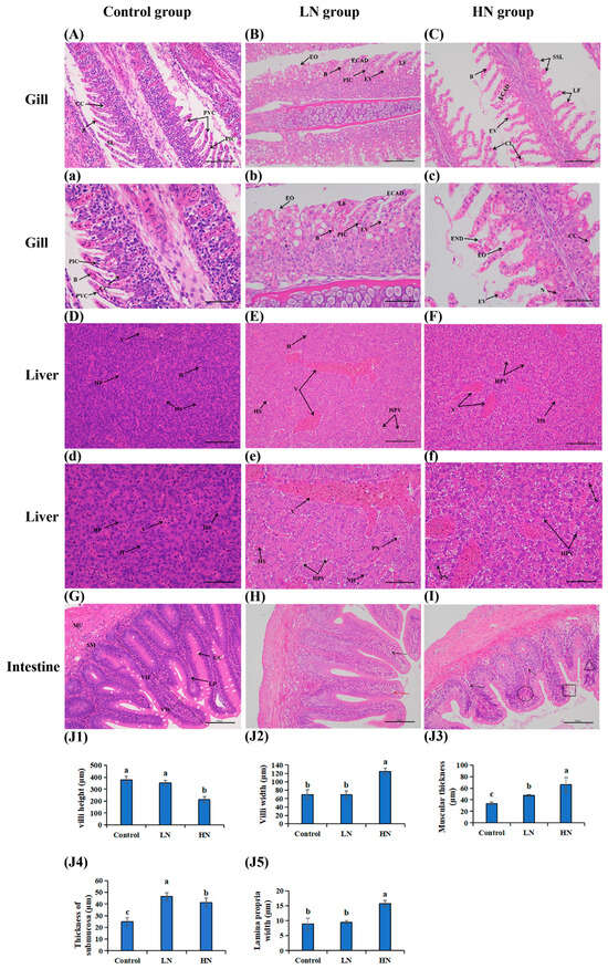The villi were observed to be neatly arranged in the control group, and the epithelial cells were unbroken (Figure 1G). On the contrary, there was marked intestinal muscular and submucosal dilatation in the low-concentration group (LN group) (Figure 1H,J3,4), and the intestinal villi of fish were more swollen in the high-concentration group (HN group) (Figure 1I,J2) while displaying markedly increased muscular thickness (Figure 1I,J3) and lamina propria thickening (Figure 1I,J5). Meanwhile, the results demonstrated that exposure to varying concentrations of ammonia resulted in the formation of lesions of disparate types in the intestine of Amur grayling. Low concentrations induced reversible alterations, such as pillar cell vacuolation and lamina propria, while high ammonia concentration group mainly led to sparse mucous cells, cell arrangement disorder, striate border damage, and cell death.