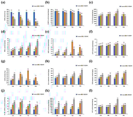 Effects of acute ammonia stress on liver and gill metabolic enzymes in adult Amur grayling (Thymallus grubii). (a) liver SOD; (b) liver GSH-Px; (c) liver CAT; (d) liver MDA; (e) liver AKP; (f) liver ACP; (g) liver LZM; (h) liver ammonia content; (i) gill ammonia content; (j) gill Na+/K+-ATPase; (k) liver ALT; (l) liver AST. Different capital letters above the bars indicate significant differences (p < 0.05) at different time points of same group and different small letters above the bars indicate significant differences (p < 0.05) in different groups at the same time point.