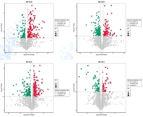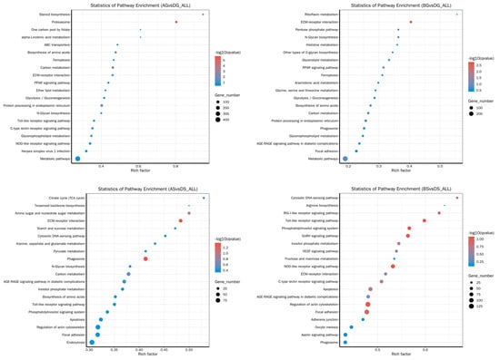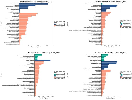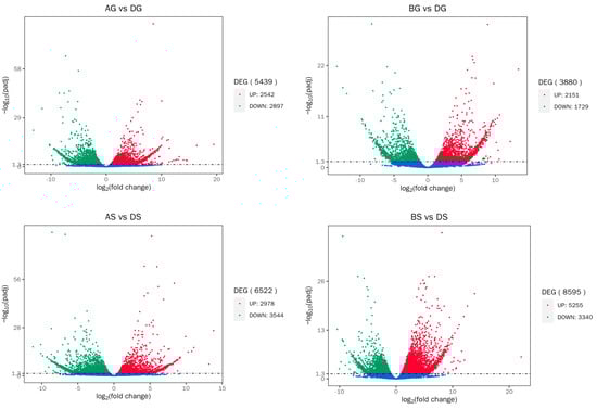 To validate the accuracy of the sequencing results, typical DEGs (AG vs. DG, BG vs. DG, AS vs. DS, and BS vs. DS) were selected for comparison via qRT-PCR verification. Gene-specific primers were designed using Primer Premier 6.0 and synthesized by Sangon Co., Ltd., Shanghai, China (Table S1). The relative mRNA expression level was normalized based on the expression of the β-actin gene. First-strand cDNA was synthesized using a Prime ScriptTM RT reagent kit with DNA Eraser (TaKaRa, Kyoto, Japan). The reaction mixture contained 0.4 μL of each forward and reverse primer, 5 μL of 2 × TB Green Premix Ex Taq II (Tli RNaseH Plus), 3 μL of sterile distilled H2O (dH2O), 0.2 of μL 50 × ROX Reference Dye II (Roche, Basel, Switzerland), and 1 μL of template cDNA. qRT-qPCR analysis was performed using an ABI 7500 real-time PCR instrument (Thermo Fisher Scientific). The specific cycle parameters were established at 95 °C for 180 s, 40 cycles of 95 °C for 5 s, 60 °C for 15 s, and 72 °C for 30 s. The 2−ΔΔCT method was employed for the calculation of the relative gene expression levels [].