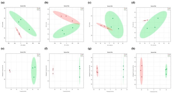 (a–d) PCA of LC-MS metabolite profiles of four comparison groups. (e–h) OPLS-DA of LC-MS metabolite profiles of four comparison groups. Notes: AG: low-ammonia concentration group of liver; D: control group of liver, BG: high-ammonia concentration group of liver, AS: low-ammonia concentration group of gill C: control group of gill, BS: high-ammonia concentration group of gill.