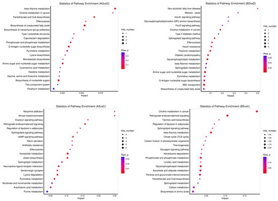 The metabolomic analysis showed that ammonia exposure resulted in various differentially expressed metabolites (DEMs) in fish liver and gills. The PCA (Figure 6a–d) and OPLS-DA (Figure 6e–h) results showed that the expression levels of some metabolites varied significantly between the control and ammonia-stress groups (p ≤ 0.05). In total, 256, 253, 299, and 112 DEMs were identified in the AG vs. D, BG vs. D, AS vs. C, and BS vs. C comparisons, respectively (Figure 7). Most of these metabolites were classified as “carbohydrates and carbohydrate conjugates”, “glycerophosphocholines”, and “amino acids, peptides, and analogues” (Figure 8). Further study identified the top 20 significantly different metabolite pathways in the KEGG analysis (Figure 9). In the liver, the metabolites were significantly enriched in pyrimidine metabolism, beta-alanine metabolism, lysine biosynthesis, glycine, serine and threonine metabolism, and biosynthesis of unsaturated fatty acids. In the gills, the metabolites were significantly enriched in lysine degradation, bate-alanine metabolism, TCA cycle, carbon metabolism, and the biosynthesis of amino acids.