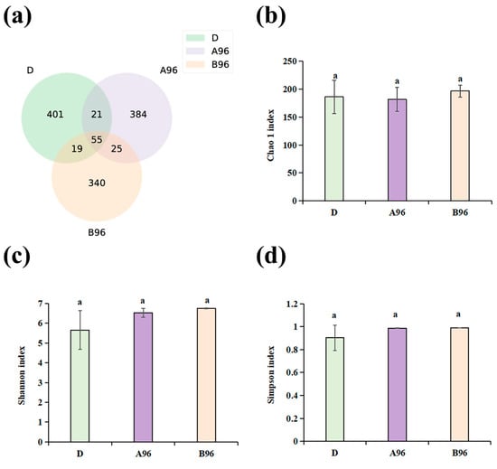 (a) Venn diagram of shared and specific ASVs among groups. Community richness index including (b) Chao1; Community diversity index including (c) Shannon and (d) Simpson. The presence of the same small letters above the bars indicates that there are no significant differences (p > 0.05) between the different groups.