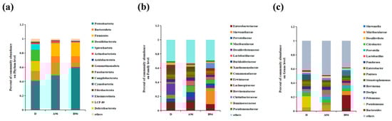 (a–c) Community bar plot analysis at phylum, family, and genus level.