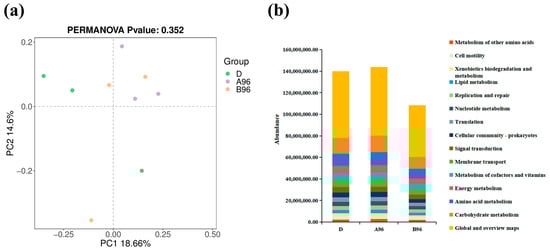 The PCoA illustrated that samples did not cluster at any ammonia concentration point (Figure 12a). A functional prediction of the intestinal microbiota was identified, comprising the top 15 functional categories (Figure 12b). The KEGG pathway abundance analysis revealed a reduction in the abundance of fifteen functional categories in the high-ammonia group, including energy metabolism of other amino acids, and carbohydrate metabolism.