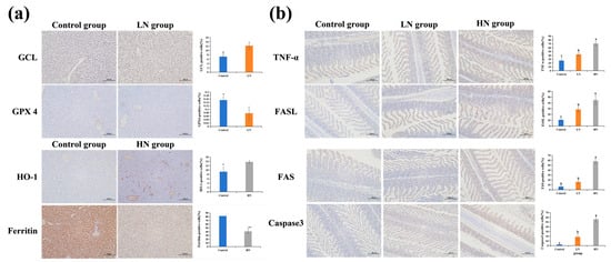 Immunohistochemical staining for the ferroptosis (a) and apoptosis (b)-related proteins in Amur grayling liver and gill tissues (200×). Scale bar, 100 μm (n = 3). Quantifications of IHC staining are shown in the panel right. The nucleus was observed to be blue, while the positive expression area of the target protein was identified as brown. * above the bars represents significant differences (p ≤ 0.05) between groups. ** above the bars represents significant differences (p < 0.01) between groups. Different small letters above the bars indicate significant differences (p < 0.05) in different groups.