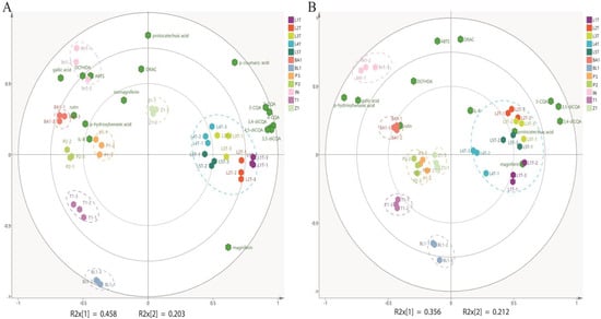 The PCA results shown in Figure 1A,B from different geographical regions can be separated according to phytochemical composition. The explained variance percentages for the vertical and horizontal coordinates of the PCA, calculated by SIMCA+ 14.1 software, exceed 50% (e.g., 6.1% and 56.8%, respectively). Prior analysis using Pearson’s Correlation was conducted to substantiate significant correlations prior to conducting PCA. The distribution patterns of the water and methanol extracts were generally similar, with a few exceptions. Samples from the same region but different farms were clustered closer to each other, compared to samples collected from different geographical regions. For example, cascara samples from Laos were found to cluster together in one quadrant while cascara from geographic locations clustered in different quadrants. Notably, cascara samples derived from In, T, and BL farms were positioned far from each other. Collectively, the data show that the phenolic acid compositions of different cascara samples and related antioxidant activity were strongly correlated with the geographical region and the farm in which they were obtained (Figure 2A,B). For example, phenolic compounds recovered from L cascara, such as chlorogenic acid isomers, 3-CQA, 4-CQA, 5-CQA, 3,4-diCQA, 3,5-diCQA and 4,5-diCQA, were clustered together in a single biplot, markedly different from samples derived from In, BA, P, and T, respectively, that were distributed on the opposite side of the biplot. Additionally, compounds such as isomagniferin, p-hydroxybenzoic acid, rutin, and gallic acid were also clustered on left side of the biplot, indicating that these compounds were somewhat common in abundance in farm locations collected from In, BA, P and T, respectively. Cascara from the In location possessed gallic acid, ABTS, and DCFH-DA measurements found in the second quadrant, thus showing a correlation between gallic acid concentration with DCFH-DA, and ABTS antioxidant activities in cascara samples that were particularly rich in gallic acid. In contrast, both T1-1-T1-3 and BL1-1-BL1-3 samples, representing farms for each location located in the fourth quadrant, were without other phenolic acids or antioxidant activity indicators in close proximity. These results provide further detail on the findings that specific geographic locations of cascara contained distinct chemical compositions relative to others, but the relative differences between farms were small.