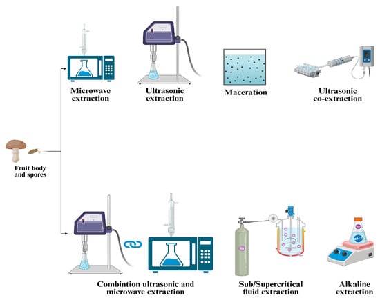 Many researchers are currently exploring the combined application of innovative extraction technologies. However, these methods require further refinement and optimizing the conditions is essential to enable their successful scalability for industrial processes []. The main extraction methods used for G. lucidum bioactive compounds are illustrated in Figure 2.
