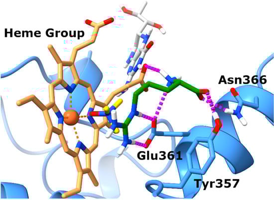Analysis of the position of the co-crystalized L-arginine evidences that the guanidinium group faces the tetrapyrrole ring and contacts the enzyme Glu361 residue via ionic interactions. Regarding the backbone of L-arginine, it also establishes favorable contacts with nearby amino acids. In particular, the carboxylate forms charge-reinforced H-bonds with both Tyr357 and Asn366 side chains, while the backbone NH3+ group forms a salt bridge with the propionate group of heme.