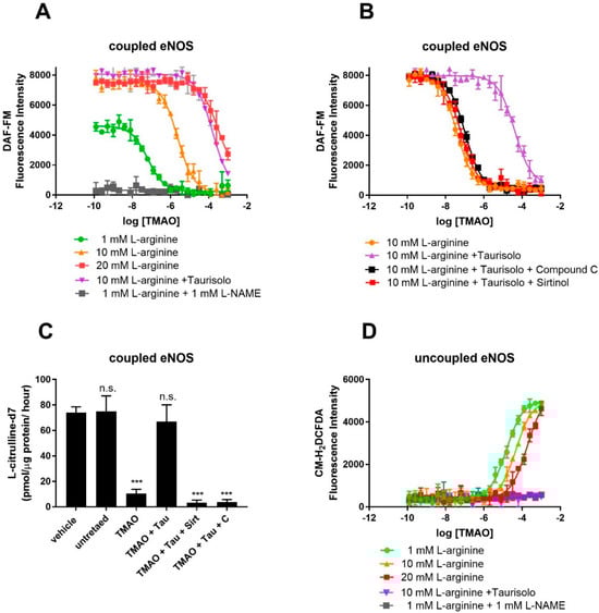 Acute as well as long-term supplementation with Taurisolo®, a TMAO inhibitor, significantly increased flow-mediated dilation in healthy subjects [32]. In spontaneously hypertensive and dexamethasone-induced hypertensive rats, supplementation with L-arginine and Taurisolo® synergistically reduced arterial blood pressure [33]. Here, we investigated the molecular mechanisms underpinning this synergism by proving that TMAO, the target of Taurisolo®, competes with L-arginine at the eNOS catalytic site and inhibits coupled eNOS activity and NO production. Coupled eNOS is associated with cardiovascular protection, as NO production promotes vasorelaxation and inhibits atherosclerosis. The synergism between L-arginine and Taurisolo® might represent a strategy to counteract ROS production by eNOS and support the healthy functioning of the cardiovascular system.