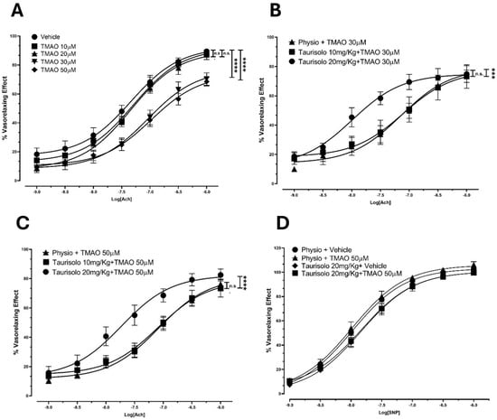 Endothelial impairment induced by TMAO and ability of Taurisolo® 20 and 50 mg/kg to significantly prevent TMAO-induced reduction in Ach-evoked vasorelaxant curve response at endothelial level. (A) Endothelial impairment induced by TMAO. Concentration–response curve induced by Ach on pre-contracted endothelium-intact rat aortic rings. Incubation with 30 and 50 µM TMAO induced a significant reduction in the Ach-induced vasorelaxant response, compared to the vehicle group. The vertical bars indicate the SEM. The asterisks indicate a significant difference from the vehicle curve obtained on endothelium-intact aortic rings (**** p < 0.0001); n.s. means “not significant”. (B) Concentration–response curve induced by Ach on pre-contracted aortic rings (from rats that received Taurisolo® 10 mg/kg, 20 mg/kg, or physiological solution) incubated with 30 µM TMAO. Taurisolo® 20 mg/kg showed the ability to significantly prevent the 30 µM TMAO-induced reduction in the Ach-evoked vasorelaxant curve response. The vertical bars indicate the SEM. The asterisks indicate a significant difference from the response obtained on endothelium-intact aortic rings from the group treated with physiological solution (*** p < 0.001); n.s. means “not significant”. (C) Concentration–response curve induced by Ach on pre-contracted aortic rings (from rats that received Taurisolo® 10 mg/kg, 20 mg/kg, or physiological solution) incubated with 50 µM TMAO. Taurisolo® 20 mg/kg significantly increased the Ach-induced vasorelaxant curve response compared to the physiological solution group (physio). The vertical bars indicate the SEM. The asterisks indicate a significant difference from the physio curve obtained for endothelium-intact aortic rings (**** p < 0.0001); n.s. means “not significant”. (D) Concentration–response curve induced by SNP on endothelium-denuded, pre-contracted aortic rings (from rats that received Taurisolo® 20 mg/kg or physiological solution) incubated with 50 µM TMAO or vehicle solution. Physiological solution: physio. No differences were recorded in vasorelaxant effect of endothelium-denuded aortic rings (derived from rats injected with physiological solution or Taurisolo® 20 mg/Kg) treated with vehicle or TMAO 50 µM.