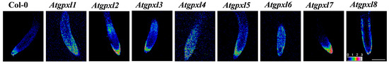 Representative images of the ratiometric analysis of redox status (ratio of fluorescence intensity at 405 and 488 nm based on the given color scale) of 6-day-old Arabidopsis Col-0 (wild type) and Atgpxl1–8 mutant roots expressing a cytosolic roGFP2 fluorescent probe using an Olympus Fluoview FV1000 confocal microscope. The white scalebar is equal to 100 µm.