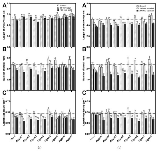 Root growth parameters of the 18-day-old Arabidopsis Col-0 and Atgpxl1–8 mutant seedlings. (a) Length of primary root (A), number of lateral roots (B), and lateral root density (C) under control conditions and after two weeks of 50 mM and 100 mM NaCl treatments. (b) Length of primary root (A), number of lateral roots (B), and lateral root density (C) after two weeks of 100 mM and 200 mM mannitol treatments. Dashed lines show the values of the untreated wild type to highlight the differences compared to those data. Data are the mean ± SE, n ≥ 45, and were analyzed using one-way ANOVA followed by Duncan’s multiple range test. Different letters represent data considered statistically significant at p ≤ 0.05.