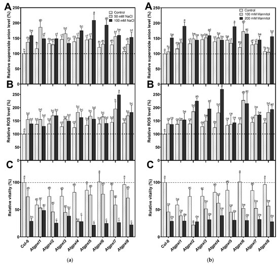(a) The superoxide anion (A), total ROS levels (B), and the intensity of metabolic activity (vitality; C) in the roots of 18-day-old Arabidopsis Col-0 and Atgpxl1–8 mutant seedlings. The parameters were detected under control conditions and after two weeks of 50 mM and 100 mM NaCl treatments. The values presented here are the fluorescence intensities in control%, where the control is the untreated Col-0 (mean ± SE, n ≥ 45). (b) The superoxide anion (A), total ROS levels (B), and the intensity of metabolic activity (vitality; C) in the roots of 18-day-old Arabidopsis Col-0 and Atgpxl1–8 mutant seedlings. The parameters were detected under control conditions and after two weeks of 100 mM and 200 mM mannitol treatments. The values presented here are the fluorescence intensities in control%, where the control is the untreated Col-0 (mean ± SE, n ≥ 45). Dashed lines show the values of the untreated wild type to highlight the differences compared to those data. Data were analyzed using one-way ANOVA followed by Duncan’s multiple range test, and different letters represent data considered statistically significant at p ≤ 0.05.