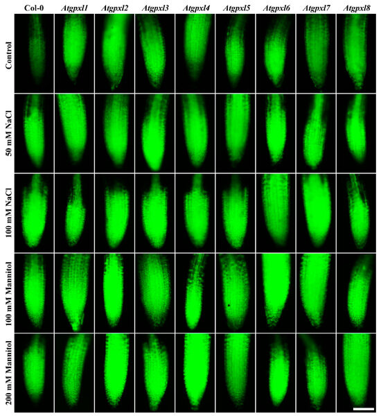 Representative fluorescent microscopy images about the total ROS levels (2′,7′-dichlorofluorescein fluorescence) in control and treated (50/100 mM NaCl, 100/200 mM mannitol) roots of 18-day-old Arabidopsis Col-0 and Atgpxl1–8 mutant seedlings. The white scalebar is equal to 100 µm.