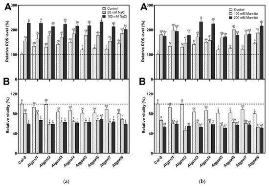 The total ROS level (A) and the intensity of metabolic activity (vitality; B) in the shoots of 18-day-old Arabidopsis Col-0 and Atgpxl1–8 mutant seedlings. (a) The parameters were detected under control conditions and after two weeks of 50 mM and 100 mM NaCl treatments. (b) The parameters were measured after two weeks of 100 mM and 200 mM mannitol treatments. The values presented here are the fluorescence intensities in control%, where the control is the untreated Col-0 (mean ± SE, n ≥ 45). Dashed lines show the values of the untreated wild type to highlight the differences. Data were analyzed using one-way ANOVA followed by Duncan’s multiple range test, and different letters represent data considered statistically significant at p ≤ 0.05.