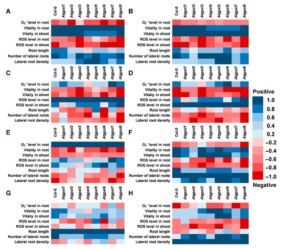 Correlation analysis between the detected and measured parameters (A) with the vitality in roots, (B) with the vitality in shoots, (C) with the total ROS level in roots, (D) with the total ROS level in shoots, (E) with the superoxide anion level in roots, (F) with the number of lateral roots, (G) with the total root length, and (H) with the lateral root density under control conditions and 2 weeks after applying 50/100 mM NaCl or 100/200 mM mannitol treatments in Arabidopsis thaliana wild type (Col-0) and Atgpxl1–8 mutant seedlings. Blue colors show a positive correlation and red colors show a negative correlation, according to the color scalebar.