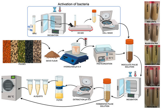 The freeze-dried fermented pulses were resuspended in phenol-red-free, glucose-free medium at a concentration of 300 mg fermented pulse/mL, sonicated for 60 min in a water bath sonicator, and centrifuged for 30 min at 4000× g; then, the supernatant was filtered through 45 μL syringe filters, and the filtrate was used for the treatments.