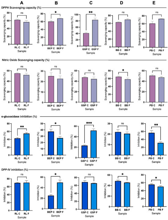 Scavenging antioxidant capacity and markers of anti-diabetic activity. Columns: (A) RL = red lentil, (B) BEP = black eyed pea, (C) GSP = green split pea, (D) BB = black bean, and (E) PB = pinto bean. RL C, BEP C, GSP C, BB C, PB C = controls, RL F, BEP F, GSP F, BB F, PB F = fermented; ns = not statistically different (p ≥ 0.05), * p ≤ 0.05, ** p ≤ 0.01, *** p ≤ 0.001.