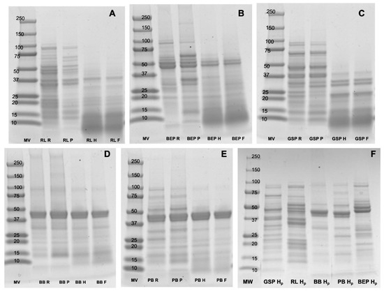 Figure 4 shows a comparison of the protein profiles for the different pulses. The main subunits of the storage proteins from RL (70 kDa and 50 kDa subunits), BB, and PB (40 kDa and 20 kDa subunit and 47 kDa subunit), GSP (40 kDa and 20 kDa, and ∼47 kDa, ∼50 kDa, ∼34 kDa, and ∼30 kDa subunits), and BEP (strong bands at 50 kDa and 47 kDa) were observed. A clear distinction was seen between the pulses that were not hydrolyzed (RL R, BEP R, GSP R, BB R, PB R; RL P, BEP P, GSP P, BB P, and PB P) and those that were hydrolyzed with commercial α-amylase (RL H, BEP H, GSP H, BB H, and PB H) (Figure 4A–E). In contrast, no significant differences in protein profiles were evident between the control (no Lp299v) and fermented pulses (RL F, BEP F, GSP F, BB F, and PB F; Figure 4F), though a few bands in the fermented pulse profile appear to be either lost or faint, suggesting the presence of smaller polypeptides, possibly below 10 kDa. Similar results were obtained by Emkani et al. [54], who reported that the proteolytic activity and-acid-production capacity of bacteria depend on the strain; for instance, lactic acid bacteria metabolize proteins from pea, leading to the formation of smaller peptide chains and free amino acids.