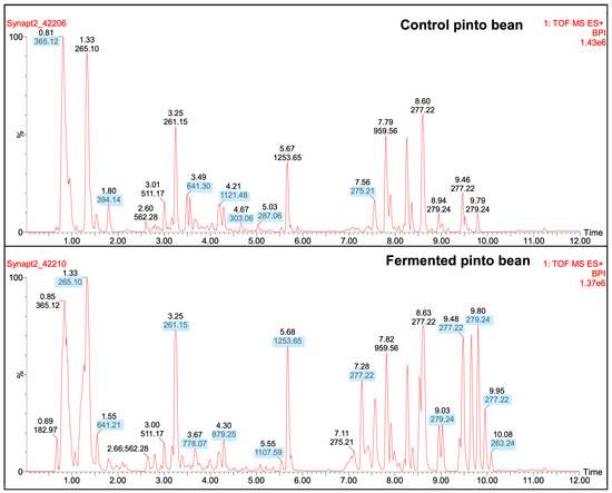 Representative results of LC-ESI-MSMS showing peaks of fermented pinto bean in comparison with the control (no Lp299v). Distinct peaks correspond to various peptides detected in the pulses. Blue highlights an increase in the intensity at specific m/z values.
