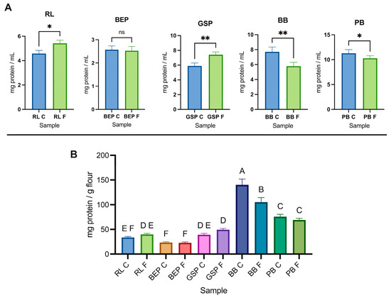 (A) Soluble protein concentration (mg/mL) in fermented and control (no Lp299v) pulse homogenates; ns (not statistically different) = p ≥ 0.05, * p ≤ 0.05, ** p ≤ 0.01, (B) Soluble protein concentration (mg/g of whole pulse flour). RL = red lentil, BEP = black eyed pea, GSP = green split pea, BB = black bean, PB = pinto bean, F = fermented, C = control. Different letters mean statistical difference between means (Tukey’s test, p ≤ 0.05).
