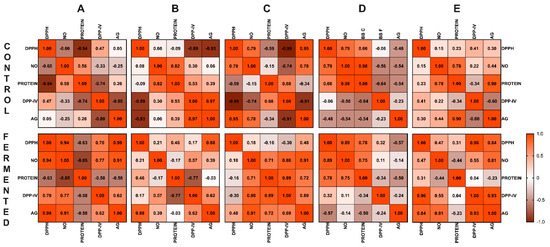 This research demonstrated the optimized antioxidant properties of pulse substrates (RL, BEP, GSP, BB, and PB) fermented with Lp299v. As reported by various authors, the bioactive compounds generated during fermentation depend on both the type and concentration of the substrate and the bacterial strain used.