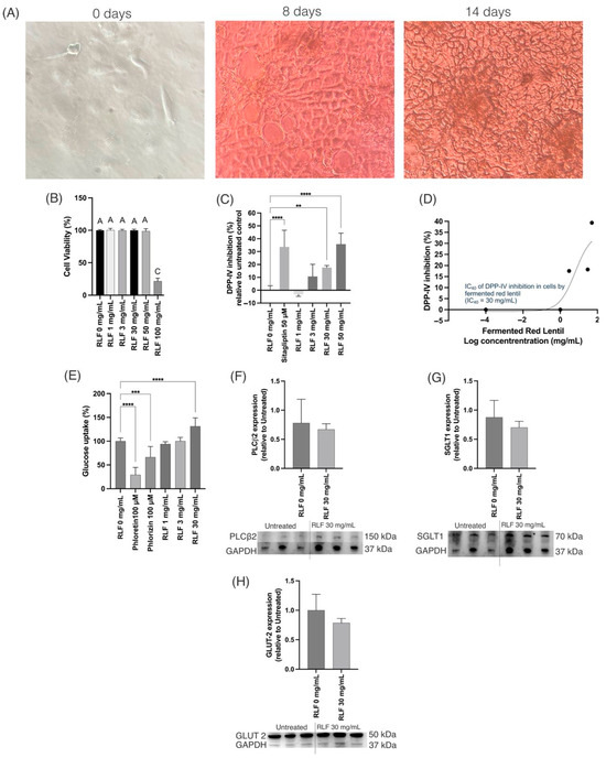 Five types of pulses, RL (Lens culinaris), BEP (Vigna unguiculata), GSP (Pisum sativum), BB (Phaseolus vulgaris), and PB (Phaseolus vulgaris), were provided by Dr. Dave Luthria from the US Department of Agriculture, purchased from local markets to ensure that they were products available to consumers. The raw pulses were ground on a commercial grinder (7 L, Robot Coupe, Blixer 6VV, Ridgeland, MS, USA) and stored in zip lock bags at 4 °C until use. L. plantarum 299v (Lp299v) was purchased from GoodBelly Probiotics (Boulder, CO, USA). The enzymes used α-amylase type VI-B was from the porcine pancreas (EC 3.2.1.1, 10.3 U/mg solid) and AG was from Saccharomyces cerevisiae (EC 3.2.1.20), and DPPH was purchased from Sigma–Aldrich (St. Louis, MO, USA). High-purity α-amylase from porcine pancreas (E-PANAA; 75,000 U/g) was purchased from NEOGEN (Lansing, MI, USA). Human dipeptidyl peptidase IV (228-10340-2) was obtained from RayBiotech (Peachtree Corners, GA, USA). An RCDC protein assay kit, a modified form of the Lowry assay that is both reducing-agent-compatible (RC) and detergent-compatible (DC), gel electrophoresis gels, and standard MW dual color were purchased from Bio-Rad (Hercules, CA, USA). Gly-Pro-p-nitroanilide (21244) was purchased from Cayman Chemicals (Ann Arbor, MI, USA). The antibody GAPDH (human sequence) was obtained from Santa Cruz Biotechnology (Dallas, TX, USA). The antibodies PLCβ2 and SGLT1, as well as 2-(N-(7-nitrobenz-2-oxa-1,3-diazol-4-il)amino)-2-deoxyglucose (2-NBDG), were purchased from Invitrogen (Carlsbad, CA, USA). The antibody Glut2 was obtained from Sigma Millipore (St. Louis, MO, USA). The secondary Amersham ECL-HRP-conjugated antibody, and Amersham Hybond P 0.45 PVDF blotting membrane were obtained from Cytiva (Marlborough, MA, USA). Clarity Western ECL substrate was purchased from Bio-Rad (Hercules, CA, USA). All other reagents were obtained from Sigma–Aldrich (St. Louis, MO, USA).