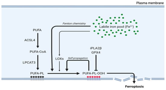 Ultimately, the reactive species attack membrane-bound PUFAs, generating lipid radicals that perpetuate the peroxidation cascade [7,8,55]. This process specifically targets membrane phospholipids containing arachidonic and adrenic acids, explaining why cells enriched with these fatty acids show increased susceptibility to ferroptosis.
