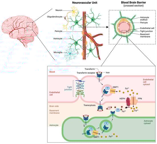 The BBB is a highly specialized, selectively permeable barrier composed primarily of brain microvascular endothelial cells joined by tight junctions alongside pericytes, astrocytic end-feet, and a supporting basement membrane (Figure 5) [10]. The BBB plays a central role in cerebral iron homeostasis by tightly regulating iron trafficking between the circulation and brain parenchyma [10].