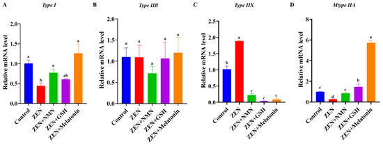 ZEN affected muscle fiber type-related gene levels, and antioxidant treatment rescued the myofiber change. (A–D) The mRNA levels of myofiber types of Type I (A), Type IIB (B), Type IIX (C), and Type IIA (D) in the aforementioned groups. Different letters (a–d) indicate significant differences (p < 0.05), and the same letters indicate no difference, n = 3.