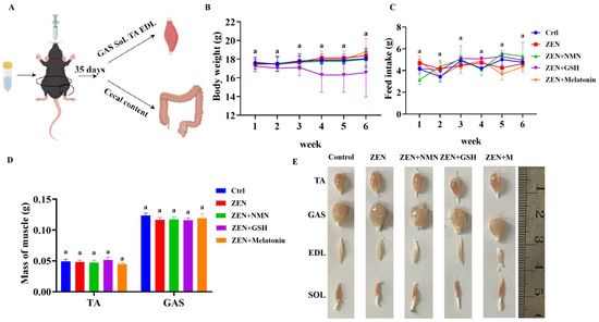 The mass of skeletal muscle is influenced by ZEN combined with antioxidant treatment. (A) A schematic diagram of gavage ZEN and antioxidant in mice was drawn by “Figdraw 2.0” software, (B,C) the body weight (B) and feed intake (C) of mice treated by ZEN and combined with antioxidants (NMN, GSH, and melatonin) for 6 weeks, (D,E) the mass (D) and images (E) of muscles (TA, tibialis anterior; GAS, gastrocnemius muscle; EDL, extensor digitorum longus; SOL, soleus) in the Control, ZEN, ZEN + NMN, ZEN + GSH, and ZEN + Melatonin groups. The same letter (a) indicates no difference, n = 6.
