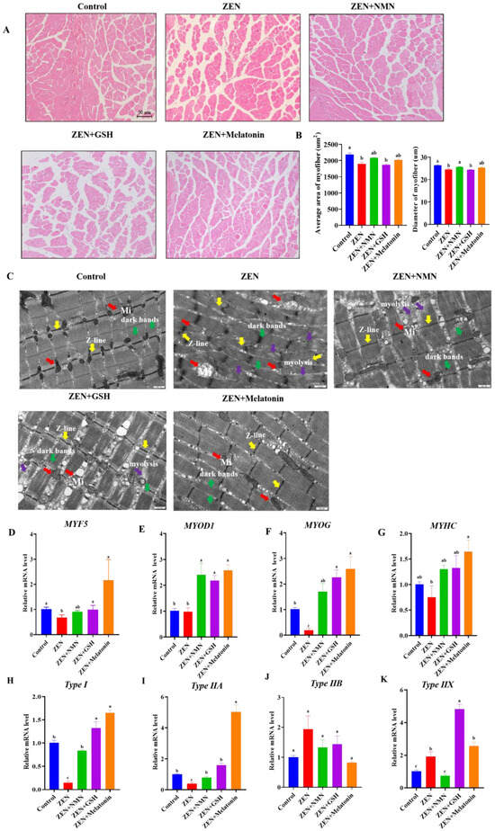 ZEN affected muscle fiber composition, and antioxidant treatment rescued the myofiber change in vivo. (A,B) The H and E staining (A) (scale bar: 50 μm) and average fiber area analysis (B) of GAS from Control, ZEN, ZEN + NMN, ZEN + GSH, and ZEN + Melatonin treated mice, (C) the ultrastructure of skeletal muscle observed by TEM, scale bar: 500 nm, (Red arrow: mitochondrial (Mi); Yellow arrow: Z-line; Green arrow: dark bands; Purple arrow: myolysis), (D–K) the mRNA level of myogenic genes (MYF5 (D), MYOD1 (E), MYOG (F), and MYHC (G)) and fiber type-specific genes (Type I (H), Type IIA (I), Type IIB (J), and Type IIX (K)) in the aforementioned groups. Different letters (a–c) indicate significant differences (p < 0.05), and the same letters indicate no difference, n = 6.
