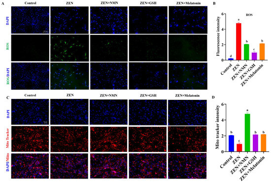 ROS levels and mitochondrial content were detected to explore the mechanism of action of ZEN on myofibers further. The data showed that the fluorescence intensity of ROS levels in the ZEN group significantly increased compared with the control group, while the ROS levels significantly reduced after the treatment of NMN, GSH, and melatonin (Figure 6A,B). Thus, Mito-Tracker staining results showed that the mitochondrial content of the ZEN group was significantly reduced compared with the Control group, while the combined treatment of NMN, GSH, and melatonin in the ZEN group significantly restored the mitochondrial staining signal (Figure 6C,D). Further, the ZEN + GSH group significantly decreased the fluorescence intensity of ROS levels compared with the ZEN + NMN and ZEN + Melatonin groups (Figure 6B). The ZEN + NMN group had the strongest mitochondria staining signal compared with the ZEN + GSH and ZEN + Melatonin groups (Figure 6D). Therefore, ZEN exposure resulted in excessive ROS accumulation, mitochondrial dysfunction, and subsequent changes in myofiber composition. Antioxidants (NMN, GSH, and melatonin) alleviated these symptoms. Among the three antioxidants, NMN has a better ability to increase mitochondrial content and reduce oxidative stress.