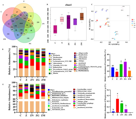 ZEN combined with antioxidants affects myofiber types through changes in the proportion of gut microbes. (A) Venn diagram of microbial OTUs in five groups (Z, ZEN group; ZN, ZEN + NMN group; ZG, ZEN + GSH group; ZM, ZEN + Melatonin group; C, Control group) of mice, (B) microbial richness (Chao1 index), (C) PCA plot of mice in five groups, (D,E) differences in the genus level (D) and species level (E) of gut microflora in the five groups of C57BL/6J mice. Different letters (a and b) indicate significant differences (p < 0.05), and the same letters indicate no difference, n = 3.