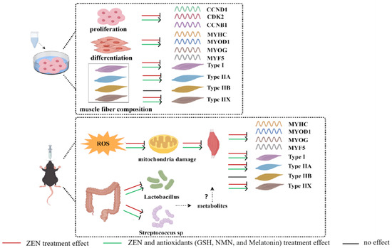 Mycotoxin contamination is widespread in the world and has become a global concern, which can lead to significant economic losses in agriculture and seriously threaten the safety of food and the health of humans [1]. ZEN, also known as F-2 toxin, is a kind of mycotoxin that has been classified as a Group 3 carcinogen by the International Agency for Research on Cancer (IARC), primarily produced by Fusarium graminearum and Fusarium culmorum in the moldy corn, sorghum, wheat, and their products of cultivation area [2]. Extensive research reported that animals were exposed to ZEN, leading to reproductive toxicity in the sow [3] and immunotoxicity or cytotoxicity in various tissues of other animals, including the liver [4] and kidney [5]. The skeletal muscle is the largest locomotor organ, protein reservoir, and primary glucose metabolism site, accounting for ~40% of individual body weight [6]. Myofibers are the basic structural units of skeletal muscle, which are roughly divided into fast (Type IIA, Type IIB, and Type IIX) and slow (Type I) muscle fibers, respectively, with glycolytic and oxidative metabolic characteristics [7]. For humans, the composition and transformation of myofiber types are linked to individual normal physiological function and exercise capacity [8], while a higher proportion of slow-twitch fibers would improve meat quality for the animals [9]. Currently, the specific damage caused by ZEN exposure to skeletal muscle and muscle fiber composition is largely unknown.