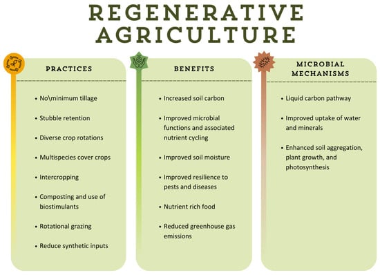 Fundamental practices of RA, benefits, and mechanisms that contribute to improved nutrient cycling, plant growth, and ecosystem resilience [23]. Original figure created by the authors.
