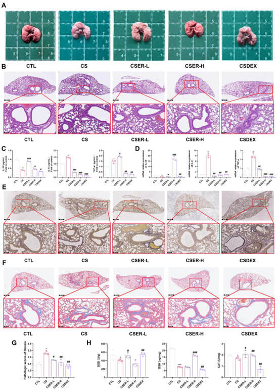 Animal experiments were performed according to ethical policies and procedures approved by the Institutional Animal Care and Use Committee of China Agriculture University, Beijing, China (Approval number NO.AW72403202-2-1). Male C57BL/6 mice (weight: 20–22 g; age: 6–8 weeks) were purchased from SPF biotechnology company (Beijing, China) and raised under standard specific pathogen-free conditions of 23 ± 2 °C and 12/12 h light/dark cycles, and given standard animal chow and water. The mice were randomly assigned into seven groups (n = 7 per group): (a) control group, (b) CS group, (c) CS + ER-L (125 mg/kg) group, (d) CS + ER-H (500 mg/kg) group, and (e) CS + DEX (2.5 mg/kg) group. Mice in the CS and CS + ER groups were placed in a homemade smoke box (40 × 30 × 25 cm) with a three-way valve to draw the smoke and guide it into the box. Commercial cigarette-removed filters, comprising 10 mg of tar, 11 mg of carbon monoxide, and 1.0 mg of nicotine per cigarette, were used in the study. The animals stimulated by CS were placed in one box, received CS from 12 cigarettes per day, 6 days/week, for a total of 10 weeks. The methods were adapted from a previous study []. ER was dissolved in normal saline and administered to the mice 1 h before CS exposure.
