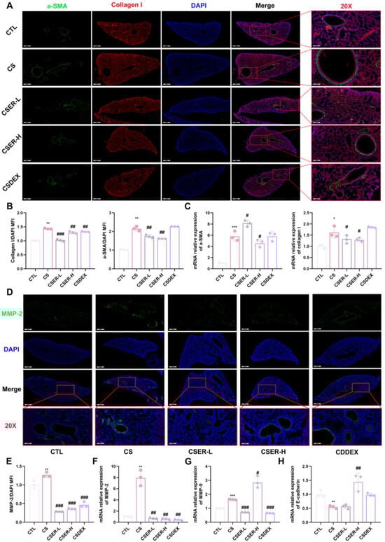 PF is the most significant cause of lung structure injury []. The specific markers of α-SMA and collagen I proteins were labeled using IF and then used to evaluate the anti-PF effect of ER. α-SMA and collagen I proteins were marked with green and red fluorescence, respectively (Figure 2A). As shown in Figure 2B, ER alleviated the pathological changes in α-SMA and collagen I in the pulmonary airway and tissue, respectively. Furthermore, the levels of α-SMA and collagen I mRNA in the lung tissue were inhibited by ER treatment (Figure 2C). Additionally, CS upregulated MMP-2 expression, which selectively degraded elastic fibers, leading to collagen deposition and uneven distribution of elastin fibers in the lungs []. However, ER inhibited the increased CS-induced MMP-2 protein secretion in the airway and lung tissue (Figure 2D,E) and significantly inhibited the up-regulation of MMP-2 and MMP-9 mRNA expression (Figure 2F,G). Moreover, ER inhibited the increase in E-cadherin mRNA expression levels associated with CS-induced PF (Figure 2H). Thus, ER inhibits CS-induced secretion of collagen I protein and MMPs, alleviating PF.