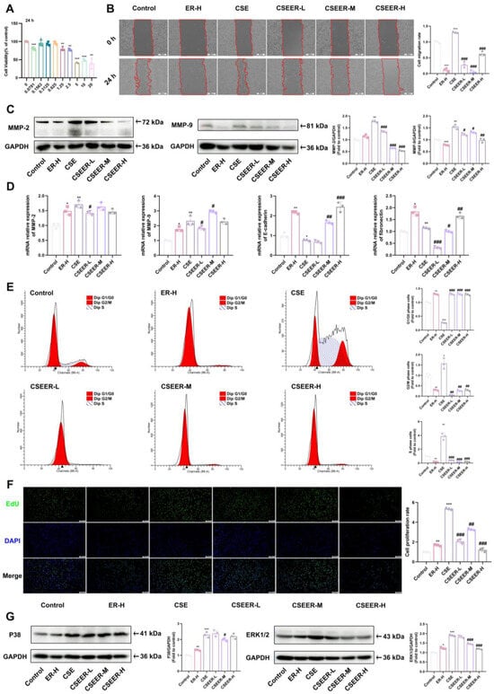 In order to investigate the effect of ER on PF, we established an in vitro model using CSE-treated L929 cells. The L929 cells were treated with a series of ER concentrations ranging from 0 to 20 mg/mL. ER at concentrations of 1.25, 2.5, and 5 mg/mL inhibited the viability of the L929 cells (Figure 3A). In the wound healing experiments, ER significantly inhibited CSE-induced L929 cell migration (Figure 3B). MMP-9 and MMP-2 proteins, two types of MMPs, were degraded in the ECM, promoting L929 cell migration []. However, ER inhibited the CSE-induced increase in MMP-9 and MMP-2 (Figure 3C) and the increase in the mRNA expression of migration-related MMP-2, MMP-9, and fibronectin while increasing the mRNA level of E-cadherin, thereby enhancing the adhesion of CSE-induced L929 cells. Meanwhile, CSE significantly promoted cell cycle progression in the L929 cells from the G1/G0 phase to the S and G2/M phases, thereby accelerating proliferation. In contrast, ER arrested the cell cycle of the L929 cells at the G1/G0 phase, consequently inhibiting proliferation (Figure 3E). Using EdU assays, we observed that ER inhibited the CSE-induced proliferation of the L929 cells (Figure 3F). P38 and ERK1/2 proteins are key targets in the regulation of the cell cycle []. The Western blot analysis showed that the expression of P38 and ERK1/2 proteins was significantly decreased in the ER-treated L929 cells (Figure 3G). Therefore, ER inhibits CSE-induced cell proliferation and migration, regulates cell cycle progression, and suppresses L929 cell activation.
