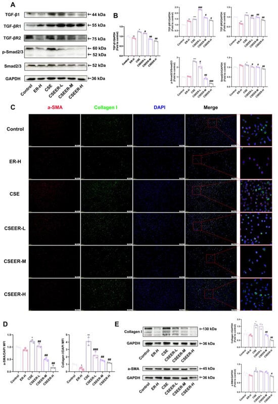 ER inhibits CSE-induced FMT and collagen deposition via the TGF-β1 signaling pathway. TGF-β1, TGF-βR1, TGF-βR2, p-Smad2/3, and Smad2/3 protein levels in L929 cells were determined using immunoblotting analysis (A). Quantification of TGF-β1, TGF-βR1, TGF-βR2, p-Smad2/3, and Smad2/3 proteins using Western blots (B). Representative IF images (scale bar = 200 μm) of collagen I (green), α-SMA (red), and DAPI (blue) expression in L929 cells (C). Quantification of collagen I and α-SMA expression in L929 cells (D). Collagen I and α-SMA protein levels in L929 cells were assessed using Western blotting (E). The results shown are mean ± SD (n = 3). Student’s t-test was used for two-group comparisons. * p < 0.05, ** p < 0.01, *** p < 0.001 compared with control. # p < 0.05, ## p < 0.01, ### p < 0.001 compared with CSE.