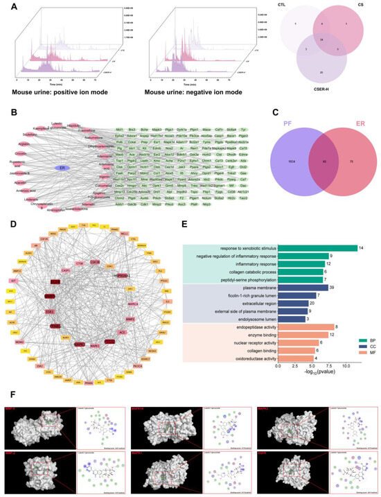 Potential active ingredients in ER were identified based on LC–MS detection of natural components in urine. The Traditional Chinese Medicine Database and Analysis Platform (TCMSP) (https://old.tcmsp-e.com/tcmsp.php; accessed on 12 November 2024) was used to identify the targets of active compounds. PF targets were searched in Drugbank, GeneCards, and Online Mendelian Inheritance in Man (OMIM) databases. Finally, a network of drug genes was constructed to extract the IDs of the overlapping genes in the databases. The overlapping targets were input into the online Database for Annotation, Visualization, and Integrated Discovery (DAVID), and enriched candidate pathways were further analyzed to identify associated biological processes.