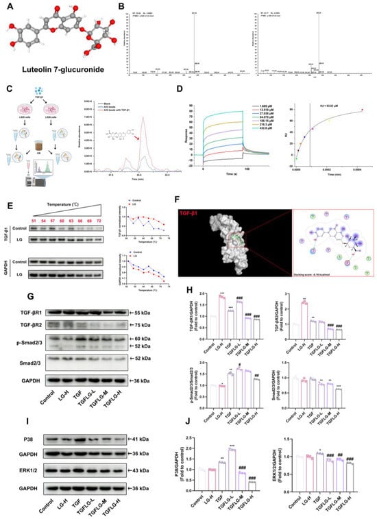 LG inhibits the TGF-β1 signaling pathway by targeted binding to TGF-β1. The chemical structure of LG (A). The MS2 fragments of the LG standard in positive ion mode and negative ion mode (B). Screening of TGF-β1-binding active ingredients in ER (C). SPR titration curve and dose–response plot of LG–TGF-β1 binding (D). Analysis of the binding affinity of LG for TGF-β1 was determined using the CETSA assay (E). Molecular docking of LG to TGF-β1 (1KLA) using MOE software (F). Representative Western blots for TGF-βR1, TGF-βR2, p-Smad2/3, and Smad2/3 protein expression and quantification of TGF-βR1, TGF-βR2, p-Smad2/3, and Smad2/3 Western blots (G,H). Representative Western blots for p38 and ERK1/2 protein expression and quantification of p38 and ERK1/2 Western blots (I,J). The results shown are mean ± SD (n = 3). Student’s t-test was used for two-group comparisons. * p < 0.05, ** p < 0.01, *** p < 0.001 compared with control. # p < 0.05, ## p < 0.01, ### p < 0.001 compared with TGF.