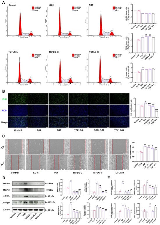 The flow cytometry analysis revealed that TGF-β1 promotes cell cycle progression in L929 cells from the G1/G0 phase to the S and G2/M phases, while LG arrested L929 cells at the G2/M phase (Figure 7A). Using EdU assays, we showed that LG inhibited TGF-β1-induced proliferation of the L929 cells in a dose-dependent manner (Figure 7B). Meanwhile, LG inhibited TGF-β1-induced migration of the L929 cells (Figure 7C) and reduced the protein and mRNA expression levels of MMP-9 and MMP-2, which promote cell migration (Figure 7D,E). LG inhibited TGF-β1-induced increases in the α-SMA and collagen I protein levels, suppressed fibronectin mRNA expression, and promoted E-cadherin mRNA expression in the L929 cells (Figure 7D,E). LG attenuates PF by inhibiting TGF-β1-induced activation and FMT in L929 cells, enhancing cellular adhesion, and reducing collagen I production.
