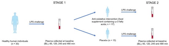 To induce systemic inflammation and oxidative stress, an intravenous infusion of a bolus containing 2 ng/kg bodyweight of Escherichia coli endotoxin, known as lipopolysaccharide (LPS; NIH-CC, Bethesda, MD, USA), was used. Whole blood was collected using EDTA-anticoagulated collection tubes at baseline (BL), 60 min, 120 min, 240 min, and 480 min after LPS infusion. Plasma was obtained immediately by centrifugation at 4 °C at 2000× g for 10 min. After centrifugation, all samples were immediately frozen in pre-labelled Eppendorf safe-lock tubes at −80 °C until analysis. After this first stage, participants were randomly assigned to take either the omega-3 fatty acid containing food supplement Vitamac (n = 17; Croma Pharma GmbH, Korneuburg, Austria) or matching lactose and wheat starch containing placebo capsules (n = 13) for 14 days. The ingredients of the food supplement are specified in Supplementary Table S1. After the 14-day intervention, all participants were challenged again with LPS in the second stage and plasma was collected at baseline (BL), 60 min, 120 min, 240 min, and 480 min after LPS infusion, applying the same protocol described for the first stage.
